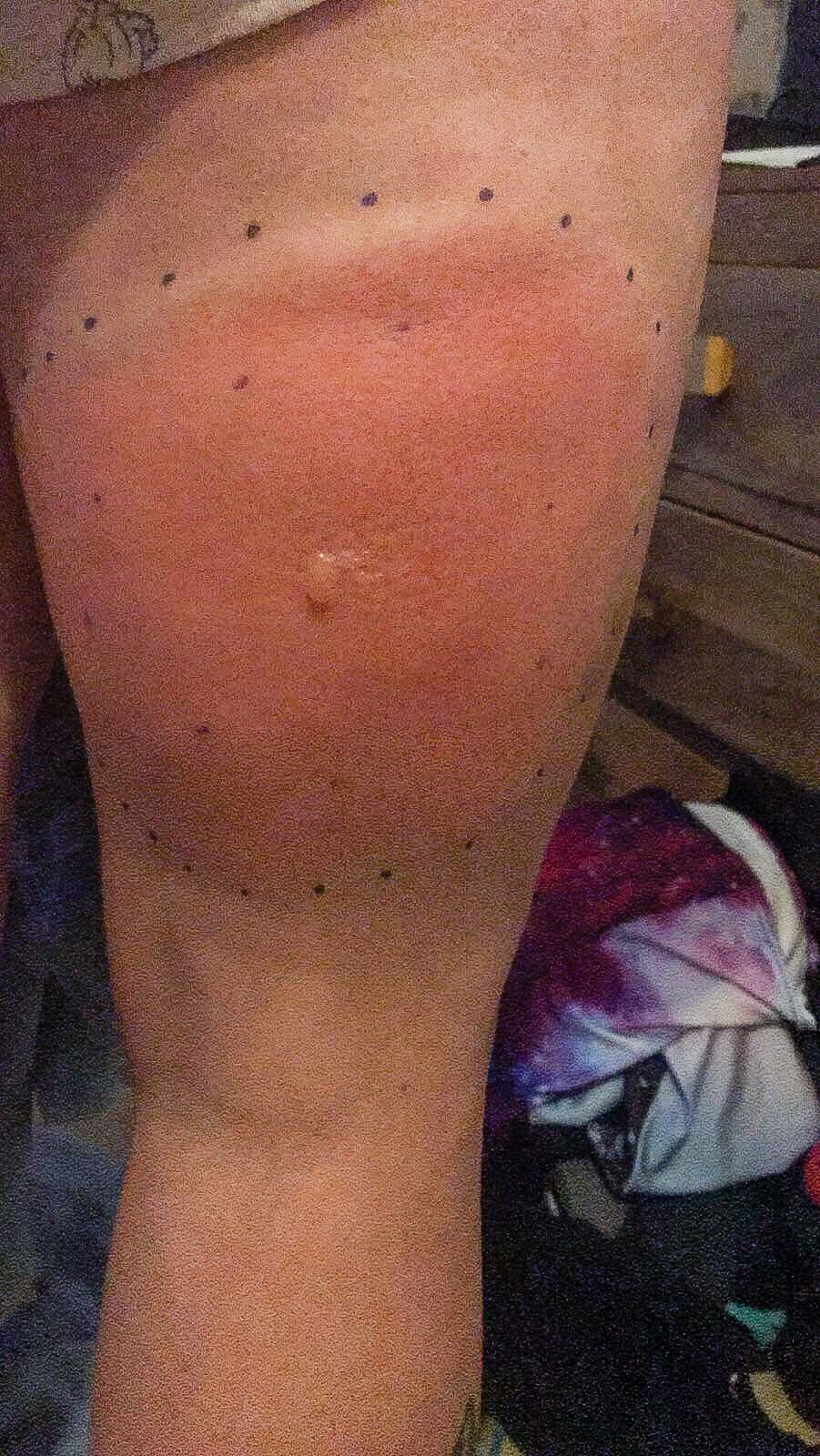 Den unge kvinnen merket et lite stikk på baklåret og trodde først at hun hadde kommet borti en brennesle. Men én time senere hadde låret hennes antatt en vanvittig størrelse, skriver The Sun.