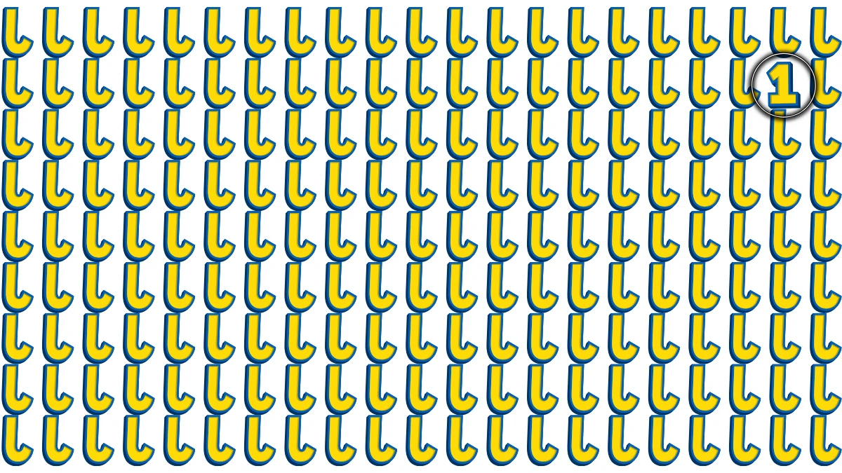 Optiske illusjoner er en morsom og effektiv måte å trene synssansen og oppmerksomheten på. I denne gåten gjelder det å skille ett enkelt tall – 1 – fra en hel flokk av nesten identiske figurer: speilvendte J-er. Formen deres er så lik at det er lett å bli lurt ved første øyekast.