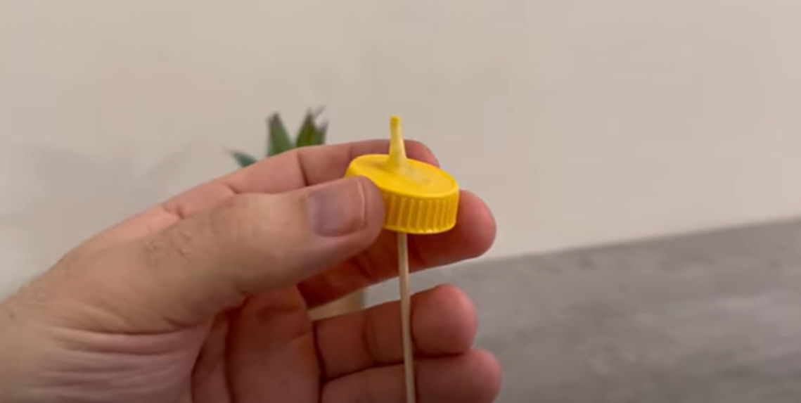 Deretter klipper du forsiktig tuppen av trespydet slik at du lager en liten åpning i lokket. Skru deretter lokket tilbake på oljeflasken.