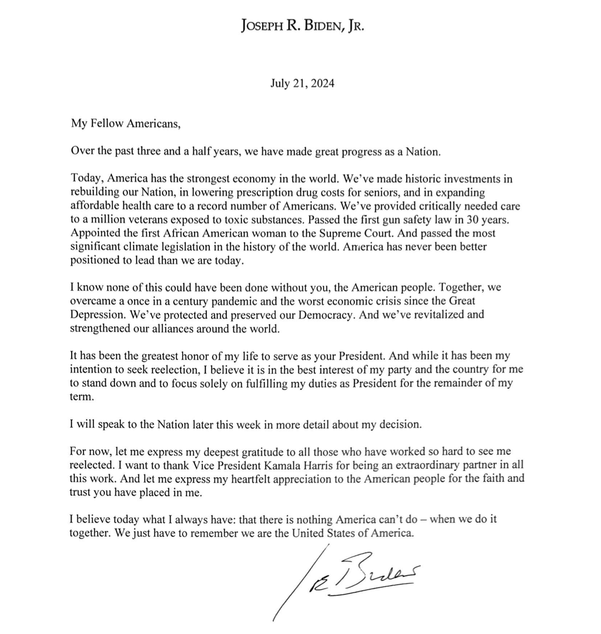 «Det har vært en stor ære å tjene som deres president de siste årene,» skrev Biden. «Selv om det var min intensjon å stille til gjenvalg, tror jeg det er i partiets og landets beste interesse at jeg trekker meg og fokuserer utelukkende på å utføre mine plikter som president for resten av min periode.»