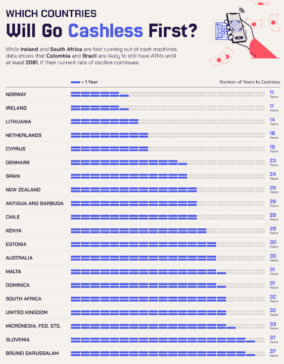 Globalt er bildet variert. Mens Norge, Irland og Litauen nærmer seg et kontantløst samfunn, viser tall fra Colombia og Brasil at de kan ha kontanter i omløp helt til 2081 dersom utviklingen fortsetter som nå.