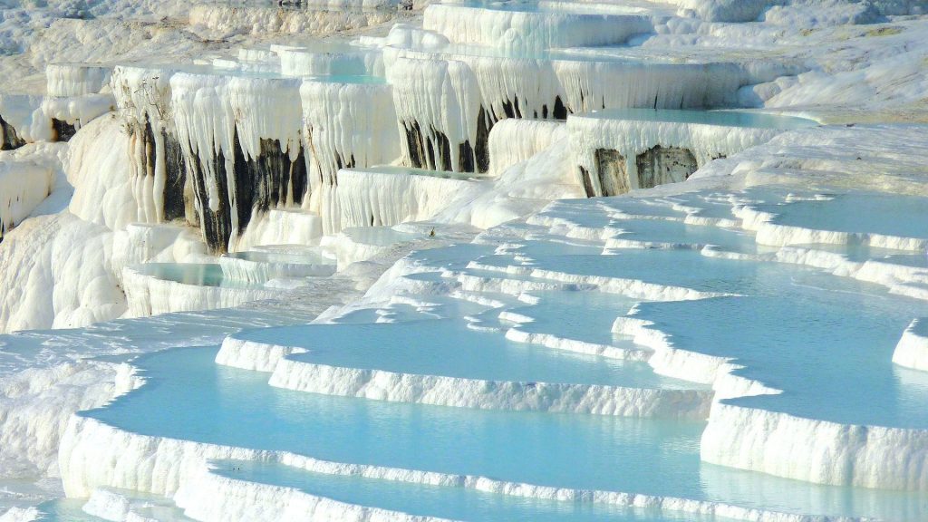 Pamukkale, som reiser seg som et frossent palass i det sørvestlige Tyrkia, ser ut som en frossen foss, men er faktisk en naturlig formasjon av hvite kalksteinsterrasser.