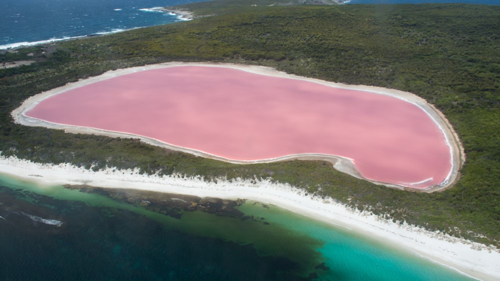 En lysende tyggegummi-rosa innsjø ved det dypblå havet – kun atskilt av en smal strekning med sand og vegetasjon – gjør Lake Hillier på Middle Island i Australia til et sant visuelt vidunder.
