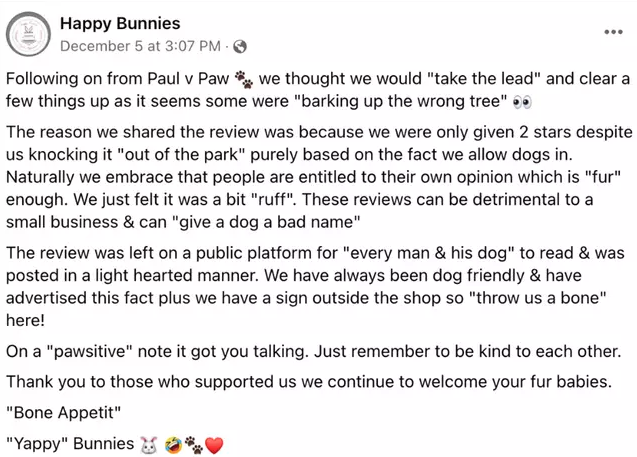 «Disse anmeldelsene kan være skadelige for en liten bedrift […]. Anmeldelsen ble lagt igjen på en offentlig plattform for «hver mann og hans hund» å lese […]. Vi har alltid vært hundevennlige og har annonsert dette faktisk, pluss at vi har et skilt utenfor butikken […]. Bare husk å være snille med hverandre. Takk til de som støtter oss, vi fortsetter å ta imot pelsungene dine.»